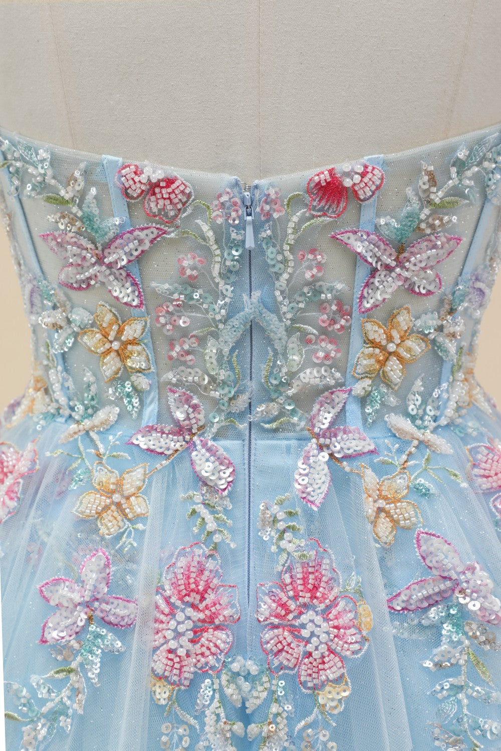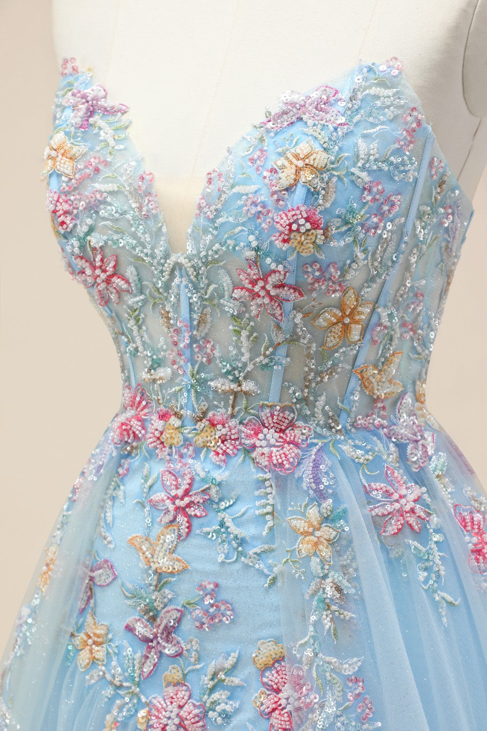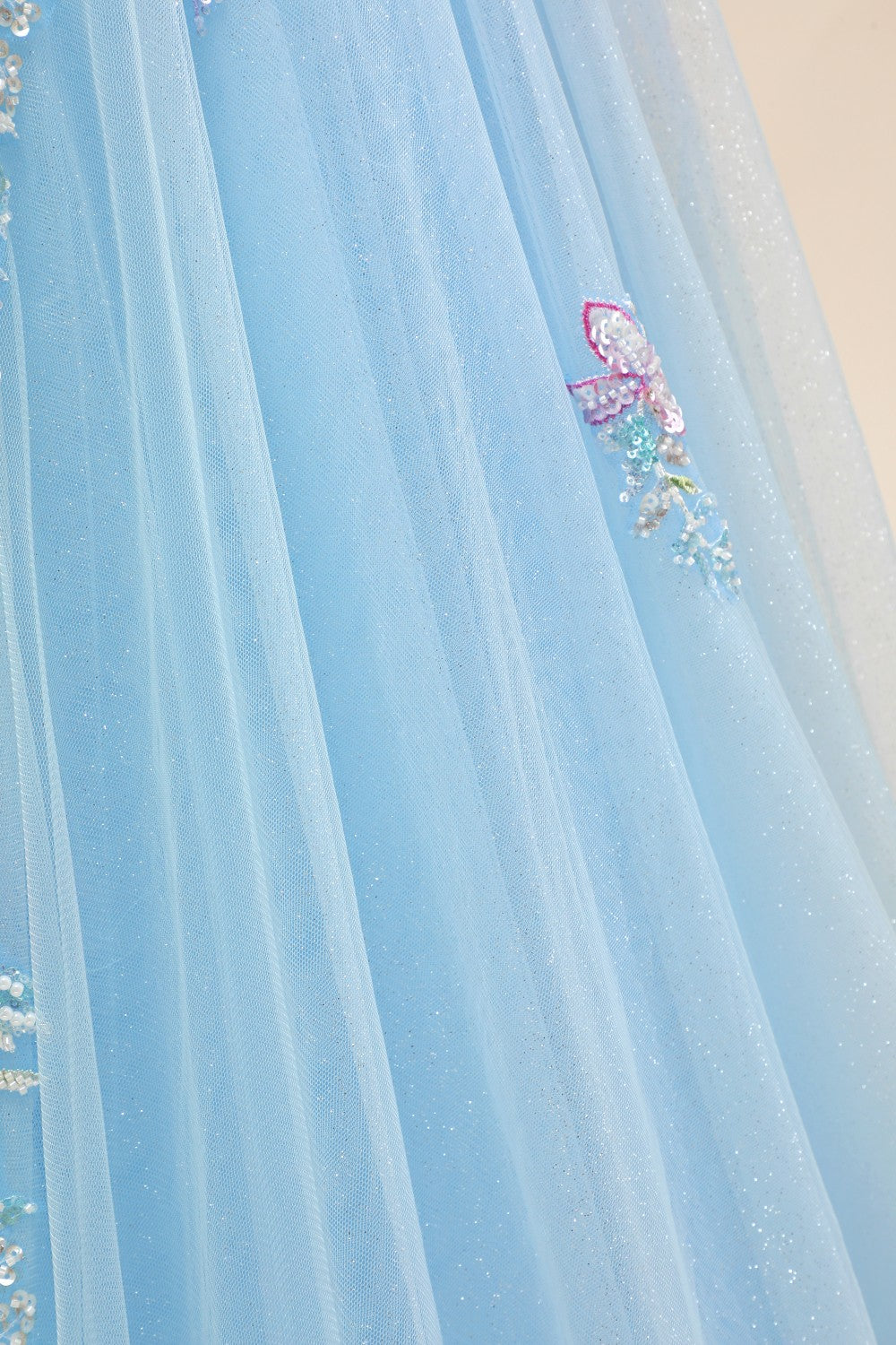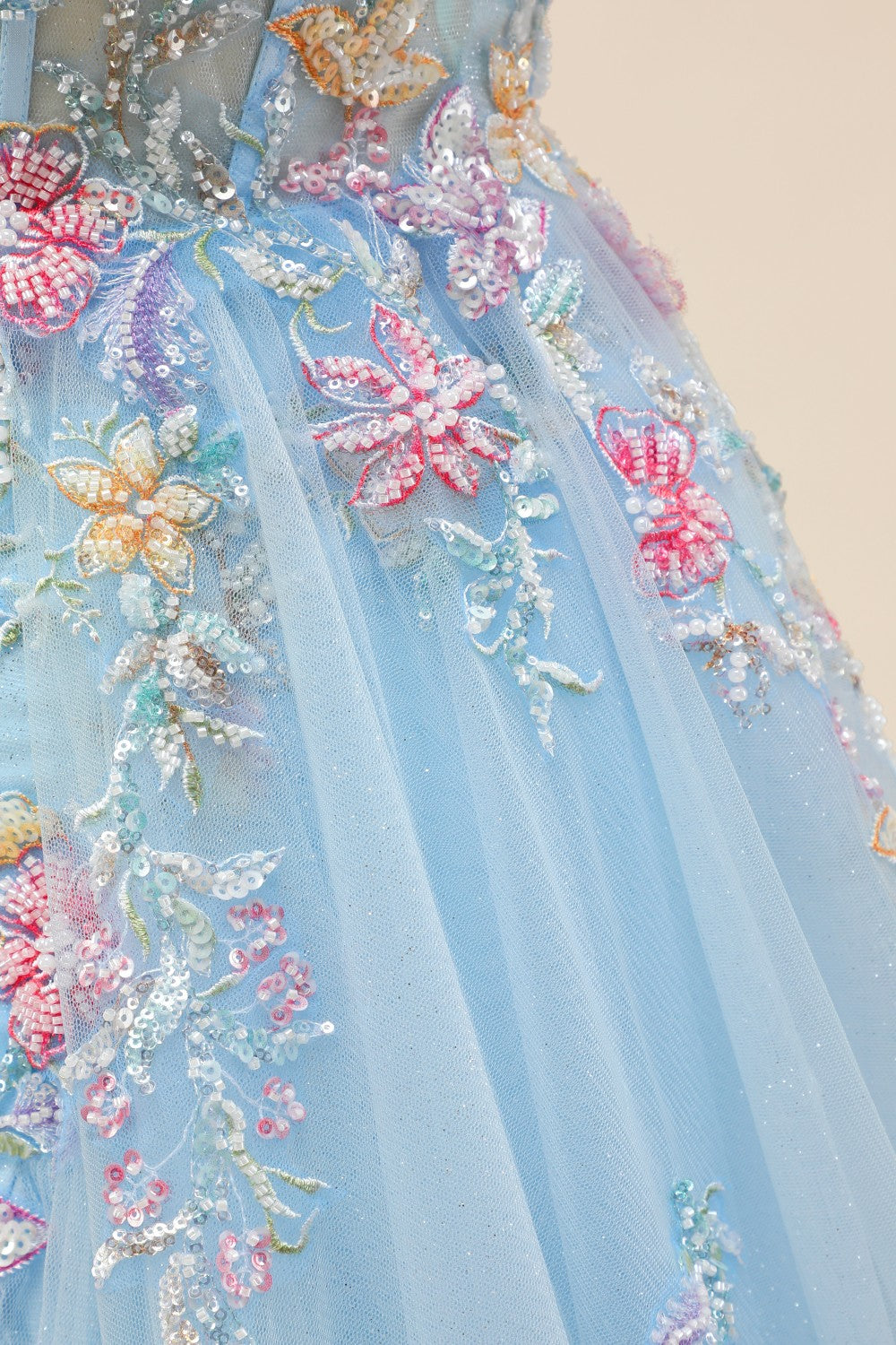 Step into a fairytale in this Dreamy Light Blue V-Neck Floral Corset Formal Gown with Tulle Train. The elegant V-neckline beautifully frames the décolletage, while the structured floral corset bodice enhances your silhouette with romantic detail and supportive shaping. Soft layers of tulle flow into a graceful train, creating ethereal movement with every step. The light blue hue adds a fresh, airy feel, perfect for formal events, galas, and unforgettable evenings. Delicate, sophisticated, and effortlessly enchanting, this gown is designed to leave a lasting impression.