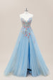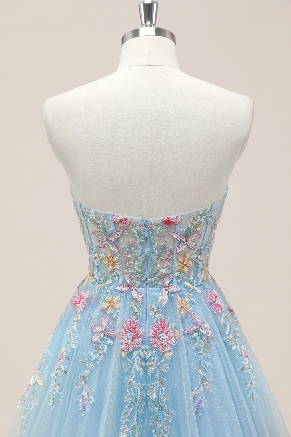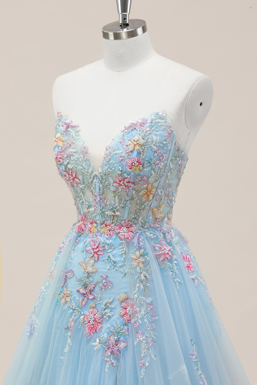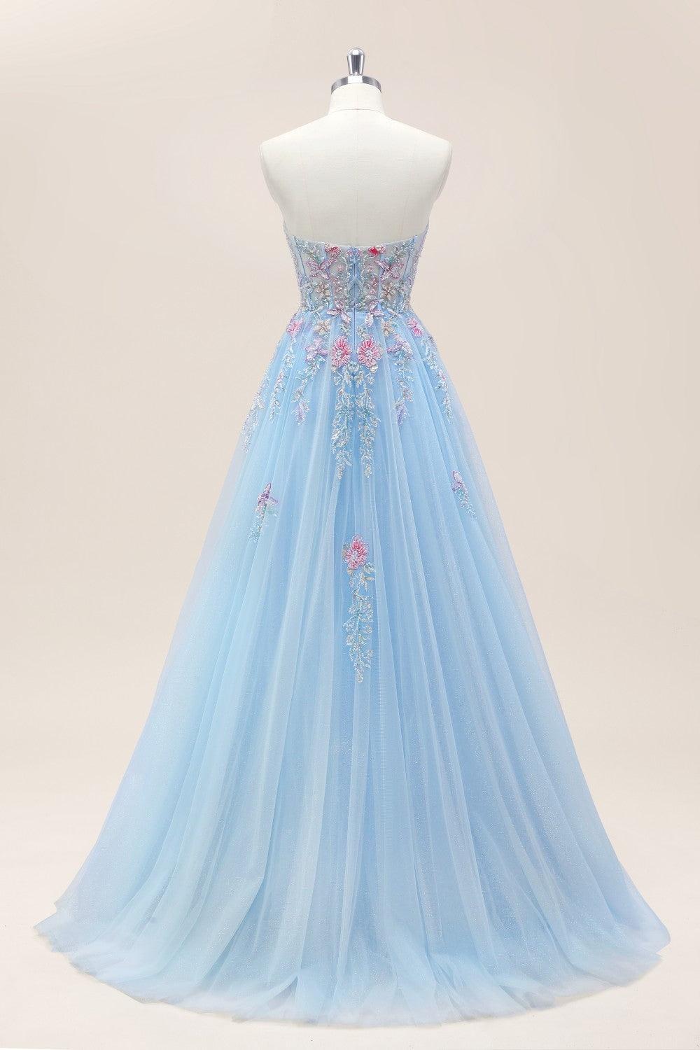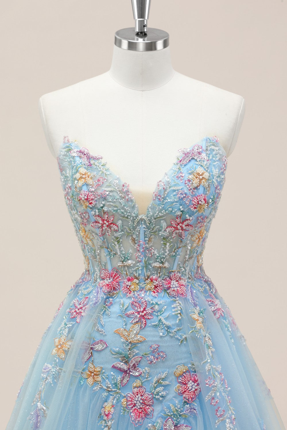 Step into a fairytale in this Dreamy Light Blue V-Neck Floral Corset Formal Gown with Tulle Train. The elegant V-neckline beautifully frames the décolletage, while the structured floral corset bodice enhances your silhouette with romantic detail and supportive shaping. Soft layers of tulle flow into a graceful train, creating ethereal movement with every step. The light blue hue adds a fresh, airy feel, perfect for formal events, galas, and unforgettable evenings. Delicate, sophisticated, and effortlessly enchanting, this gown is designed to leave a lasting impression.