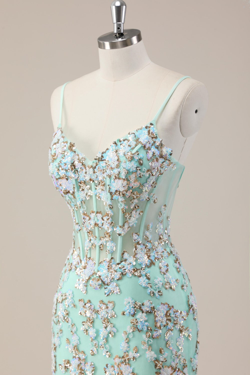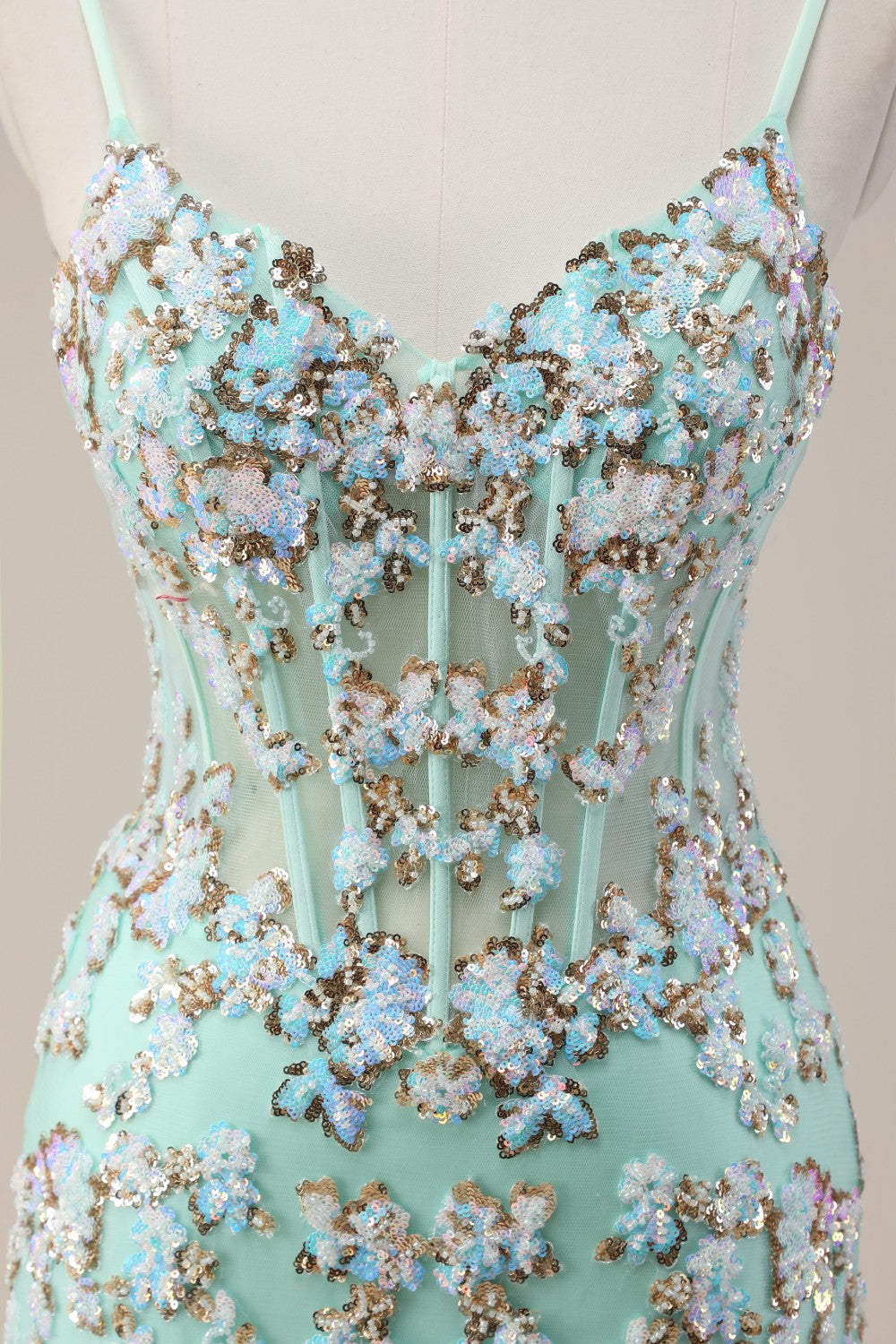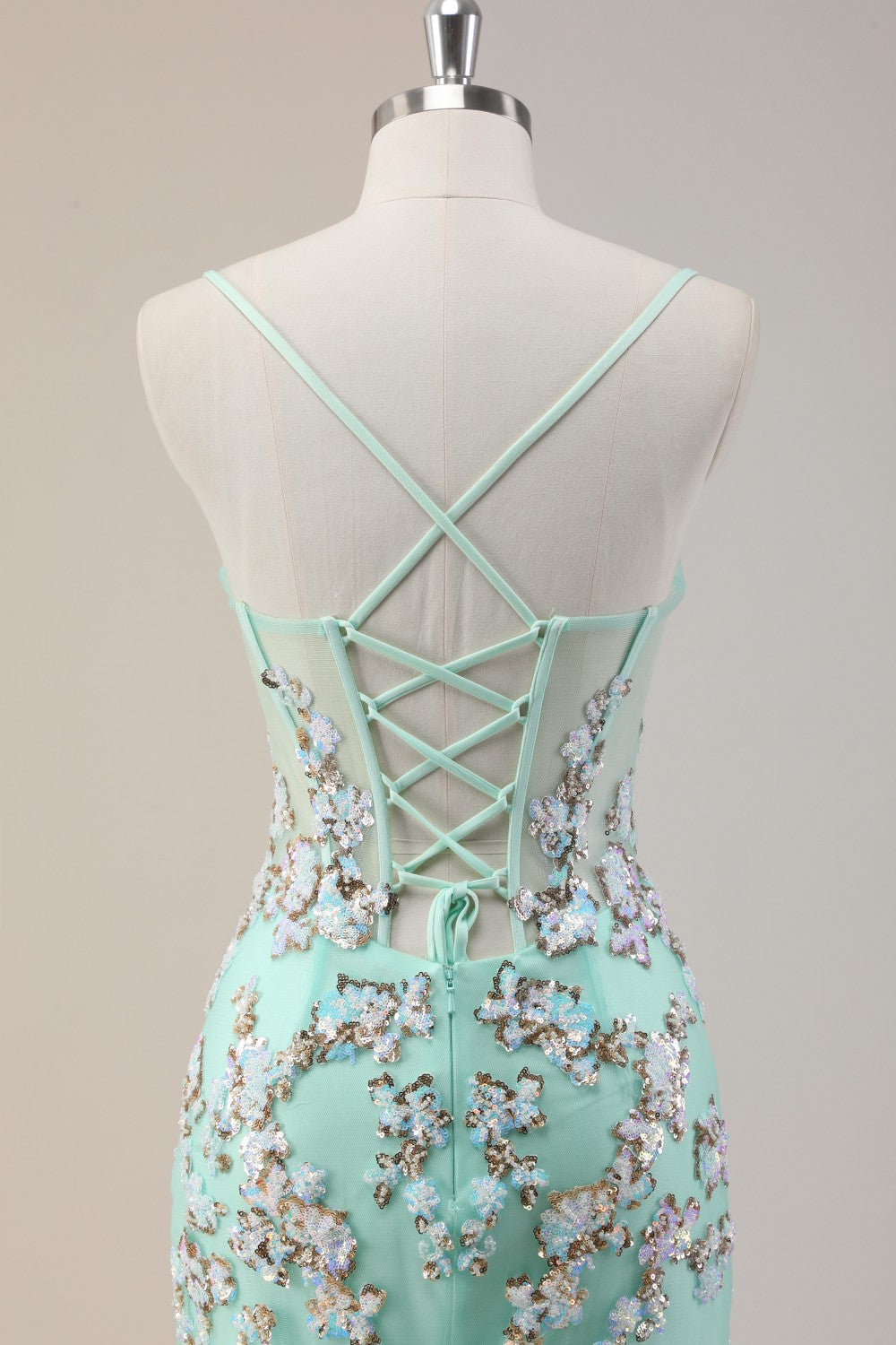 Shine with elegance in this Mint Green Spaghetti Straps Sequin Corset Mermaid Prom Dress with Tulle Skirt. The structured sequin corset bodice beautifully sculpts your waist and adds sparkling glamour, while delicate spaghetti straps frame your shoulders with a graceful touch. The mermaid silhouette hugs your curves before flaring into a soft tulle skirt, creating a stunning, ethereal flow with every step. Finished in a refreshing mint green hue, this gown combines sophistication, sparkle, and dreamy movement—perfect for prom nights and special formal occasions.