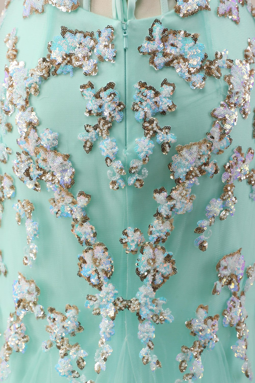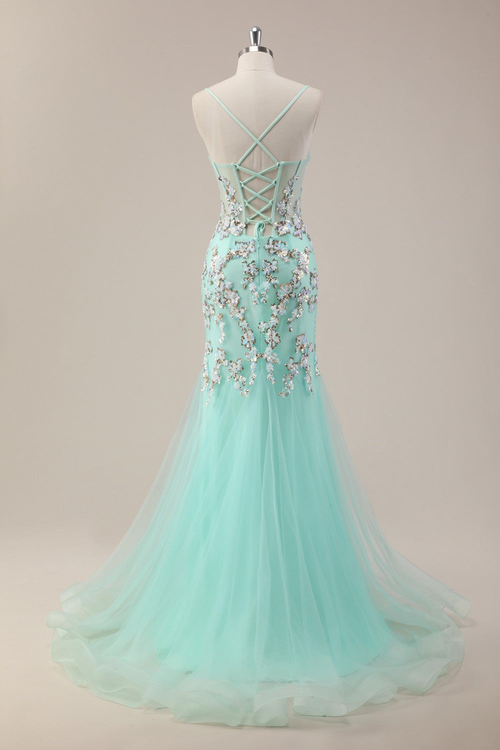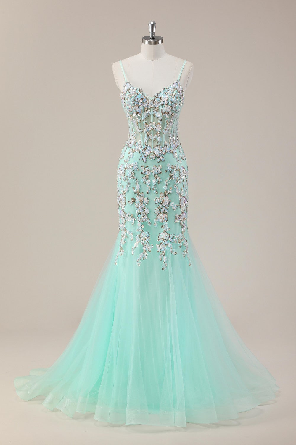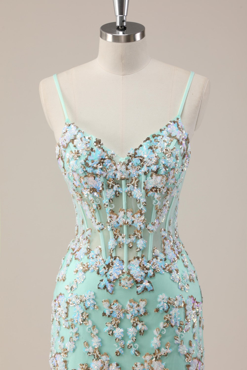 Shine with elegance in this Mint Green Spaghetti Straps Sequin Corset Mermaid Prom Dress with Tulle Skirt. The structured sequin corset bodice beautifully sculpts your waist and adds sparkling glamour, while delicate spaghetti straps frame your shoulders with a graceful touch. The mermaid silhouette hugs your curves before flaring into a soft tulle skirt, creating a stunning, ethereal flow with every step. Finished in a refreshing mint green hue, this gown combines sophistication, sparkle, and dreamy movement—perfect for prom nights and special formal occasions.