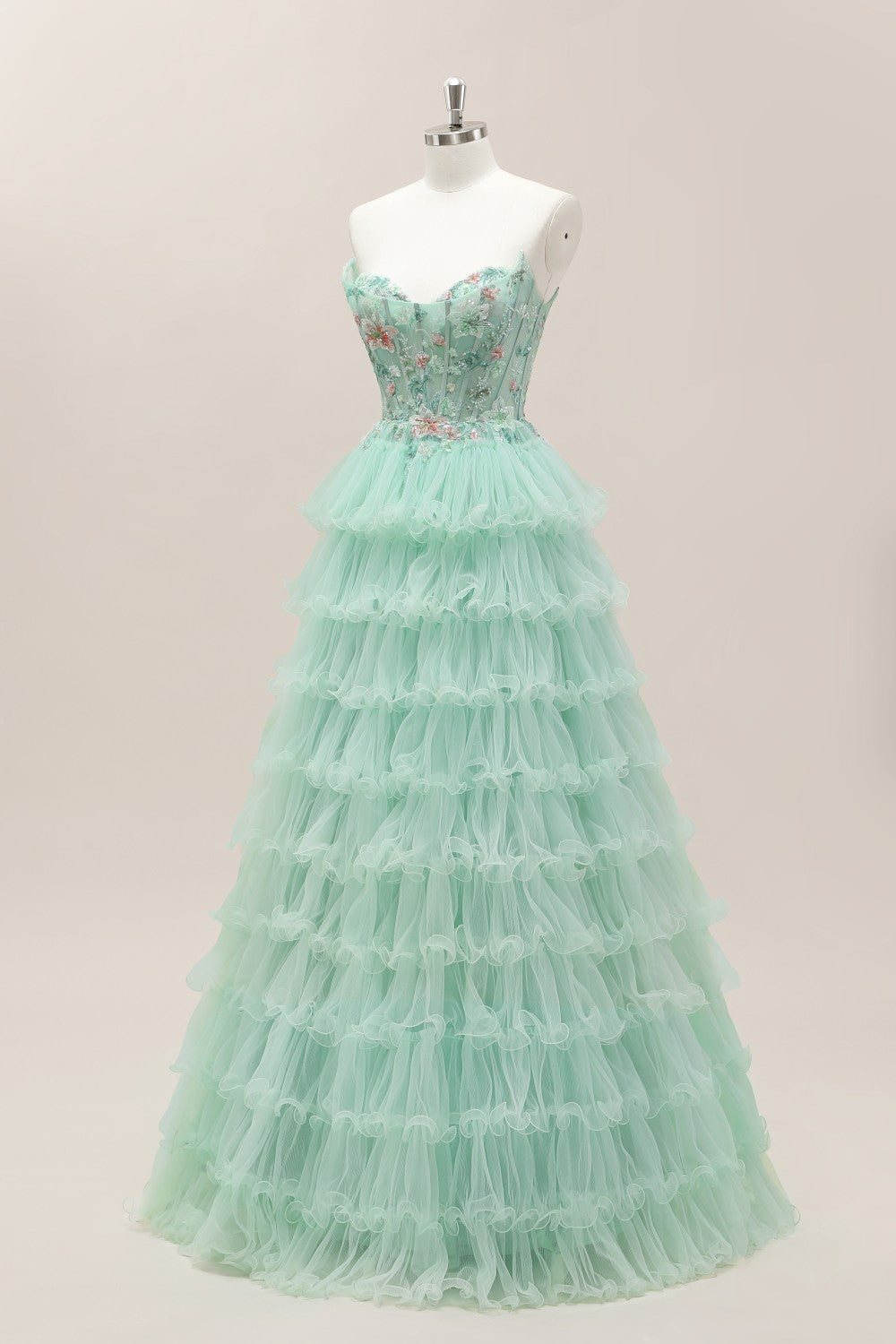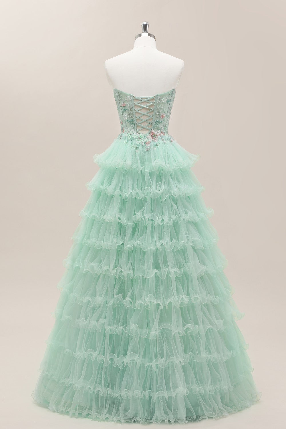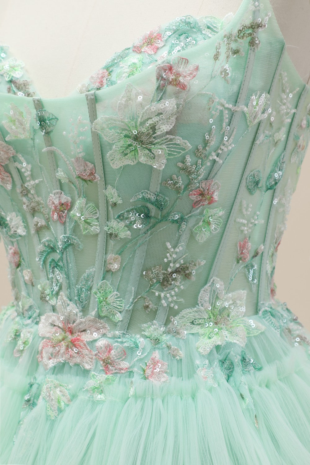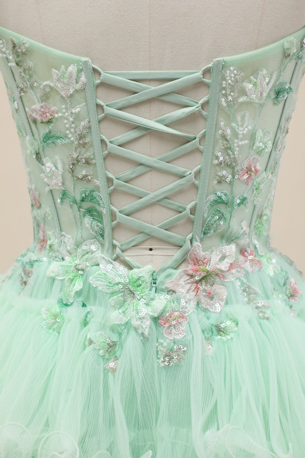 Step into a fairytale moment in this Mint Green Tiered Tulle Lace Up Ball Gown with Floral Corset Bodice. The beautifully structured corset bodice features delicate floral detailing that adds romantic charm while sculpting and supporting your figure. Layers of soft, tiered tulle create a voluminous ball gown skirt with dreamy movement and graceful flow. The lace-up back allows for an adjustable, custom-like fit, enhancing both comfort and elegance. Finished in a refreshing mint green hue, this gown is perfect for prom, formal events, and magical nights where you want to feel truly unforgettable.