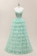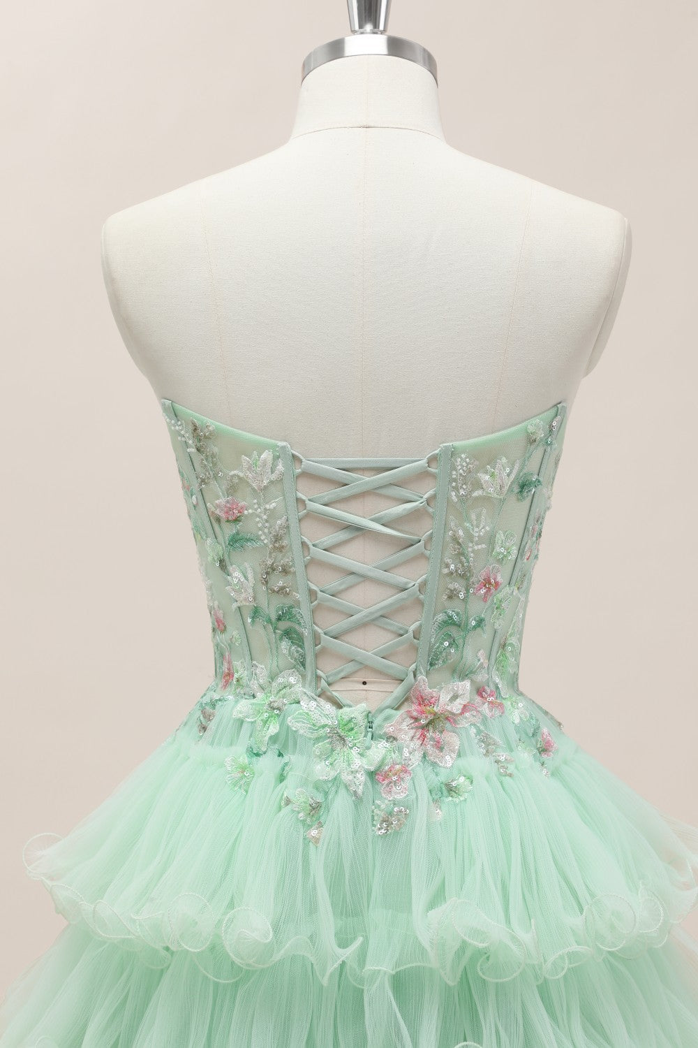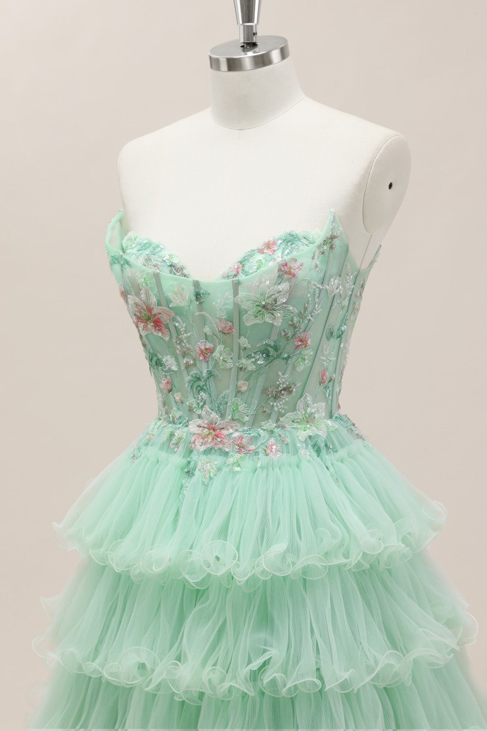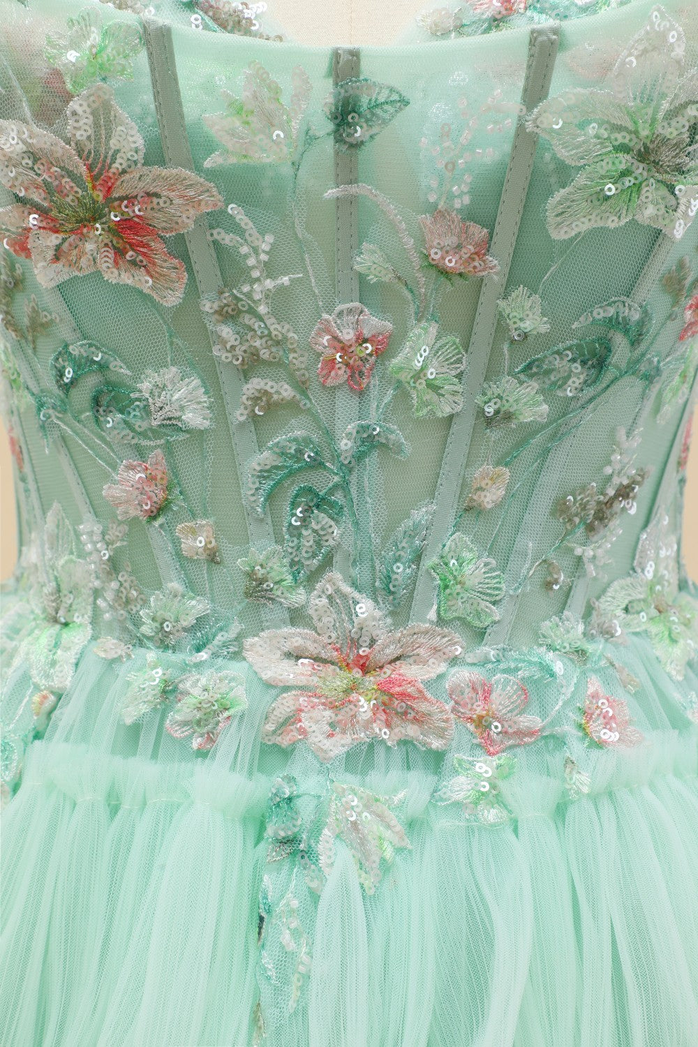 Step into a fairytale moment in this Mint Green Tiered Tulle Lace Up Ball Gown with Floral Corset Bodice. The beautifully structured corset bodice features delicate floral detailing that adds romantic charm while sculpting and supporting your figure. Layers of soft, tiered tulle create a voluminous ball gown skirt with dreamy movement and graceful flow. The lace-up back allows for an adjustable, custom-like fit, enhancing both comfort and elegance. Finished in a refreshing mint green hue, this gown is perfect for prom, formal events, and magical nights where you want to feel truly unforgettable.