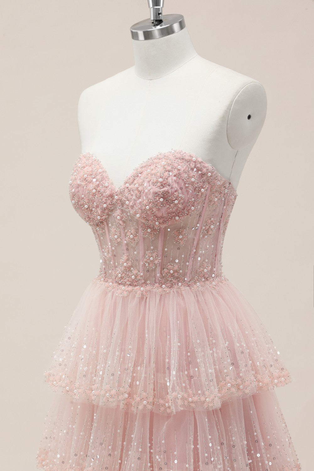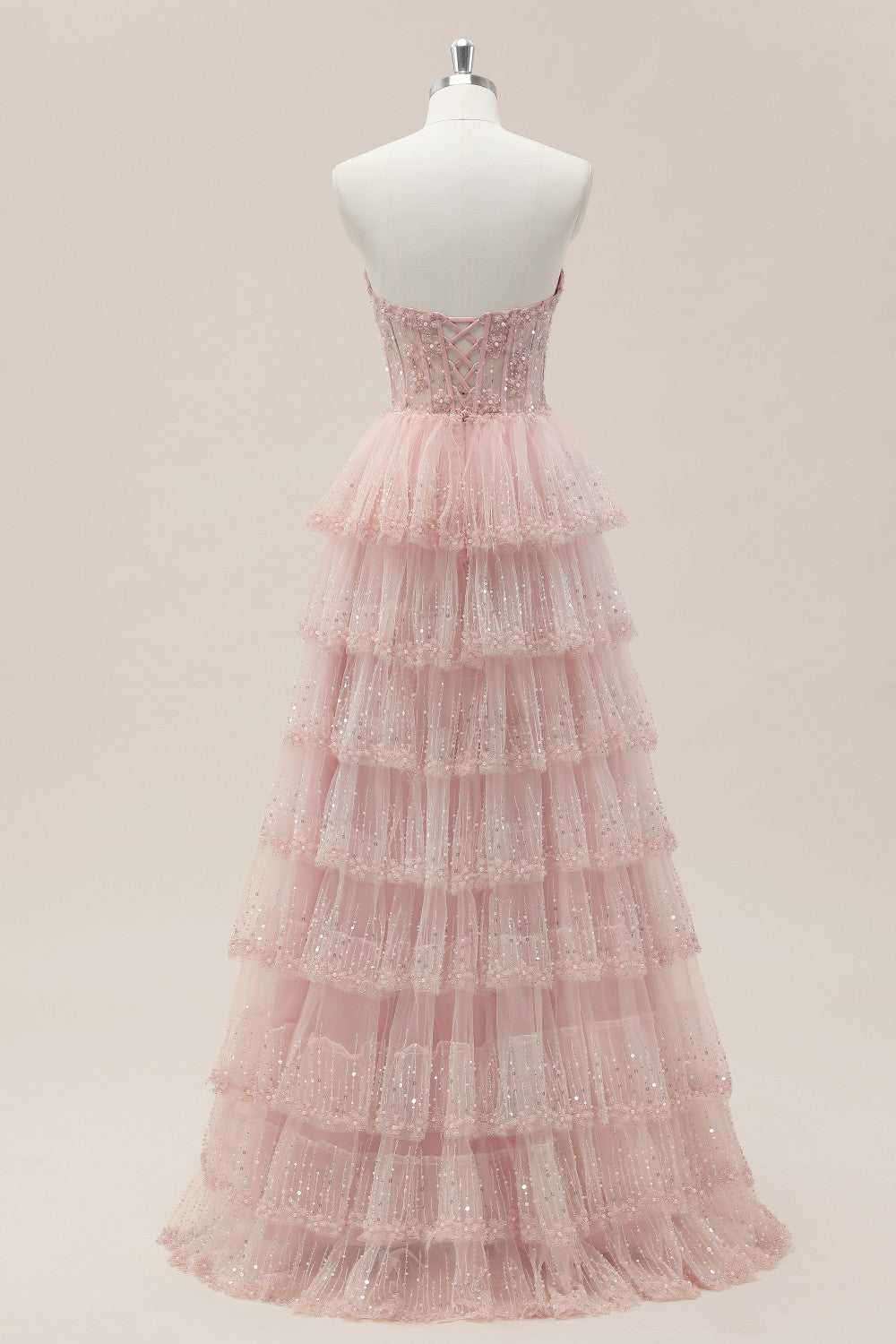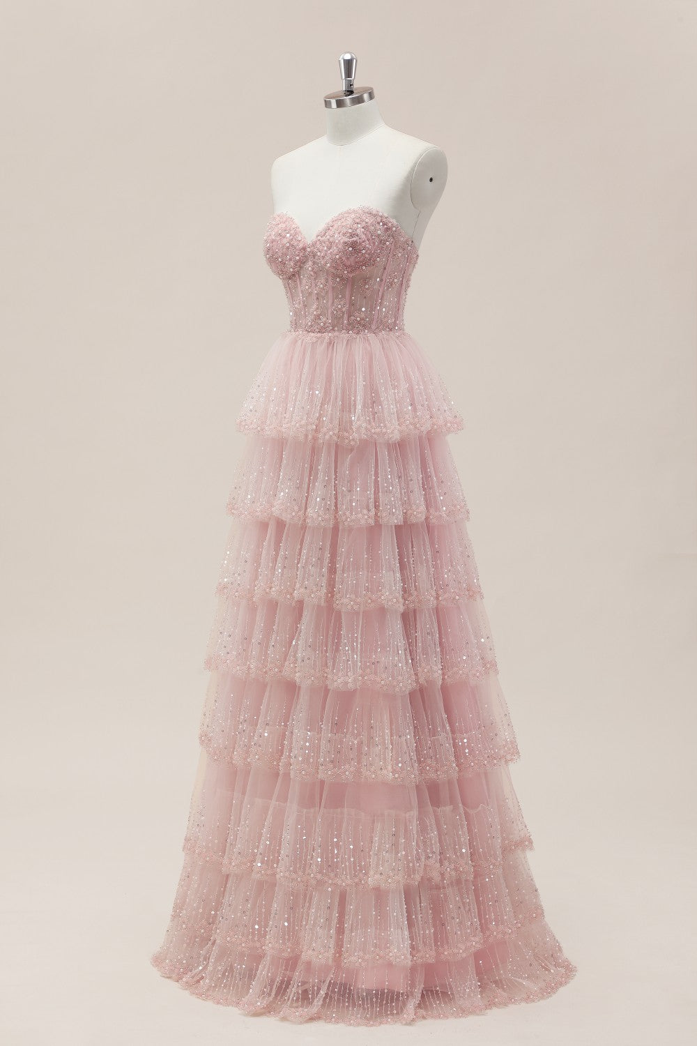 Fall in love with timeless romance in this Romantic Blush Pink Sweetheart Corset Prom Dress with Sparkly Tiered Skirt. The sweetheart neckline softly frames your décolletage, while the structured corset bodice shapes and supports for a beautifully defined silhouette. Layers of glittering, tiered fabric cascade into a dreamy skirt that catches the light with every step. Finished in a soft blush pink hue, this gown blends elegance and sparkle for a truly enchanting prom-night look. Perfect for making a graceful yet unforgettable entrance.