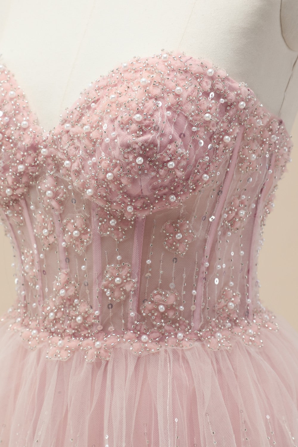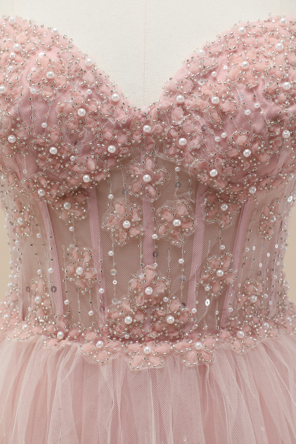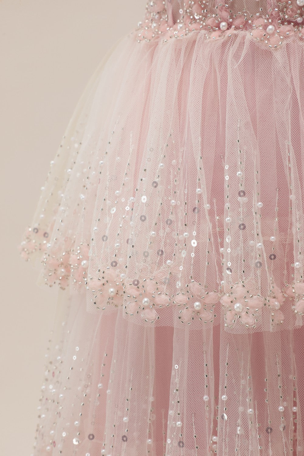 Fall in love with timeless romance in this Romantic Blush Pink Sweetheart Corset Prom Dress with Sparkly Tiered Skirt. The sweetheart neckline softly frames your décolletage, while the structured corset bodice shapes and supports for a beautifully defined silhouette. Layers of glittering, tiered fabric cascade into a dreamy skirt that catches the light with every step. Finished in a soft blush pink hue, this gown blends elegance and sparkle for a truly enchanting prom-night look. Perfect for making a graceful yet unforgettable entrance.